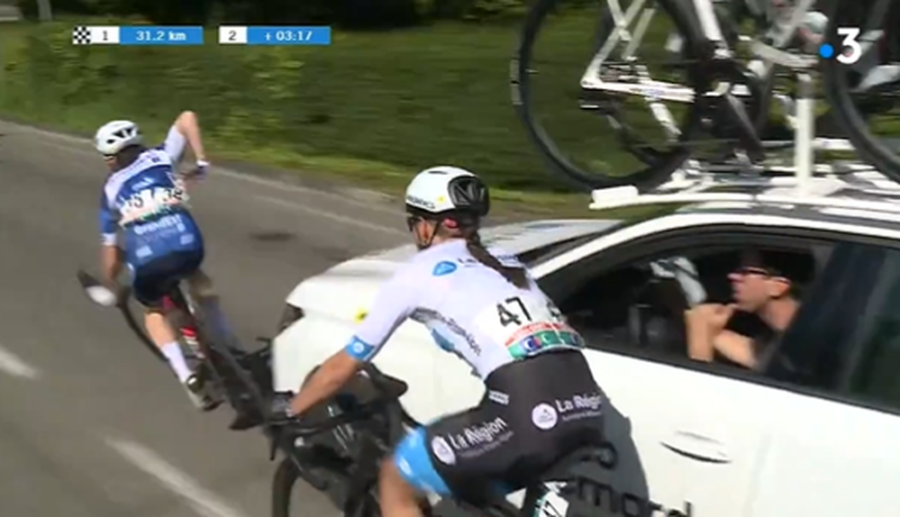 Enquanto dava indicações a Célia Gery, que acabou por ganhar a prova, o diretor desportivo, que conduzia o carro de apoio, tocou na roda traseira da ciclista da Grand Est, provocando a queda desta e, consequentemente, também de Gery.