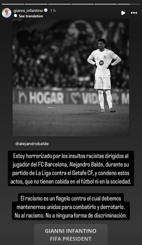 Gianni Infantino, presidente da FIFA, mostrou-se «chocado» com os insultos racistas dirigidos a Álex Baldé, durante o encontro entre o Getafe e o Barcelona, condenando a situação.