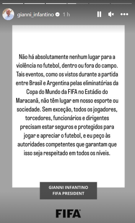 «Não há absolutamente lugar algum para a violência no futebol, dentro ou fora do campo. Tais eventos, como os vistos durante a partida entre Brasil e Argentina nas eliminatórias do campeonato do mundo no Estádio do Maracanã, não têm lugar no nosso desporto ou sociedade», referiu, nas redes sociais.