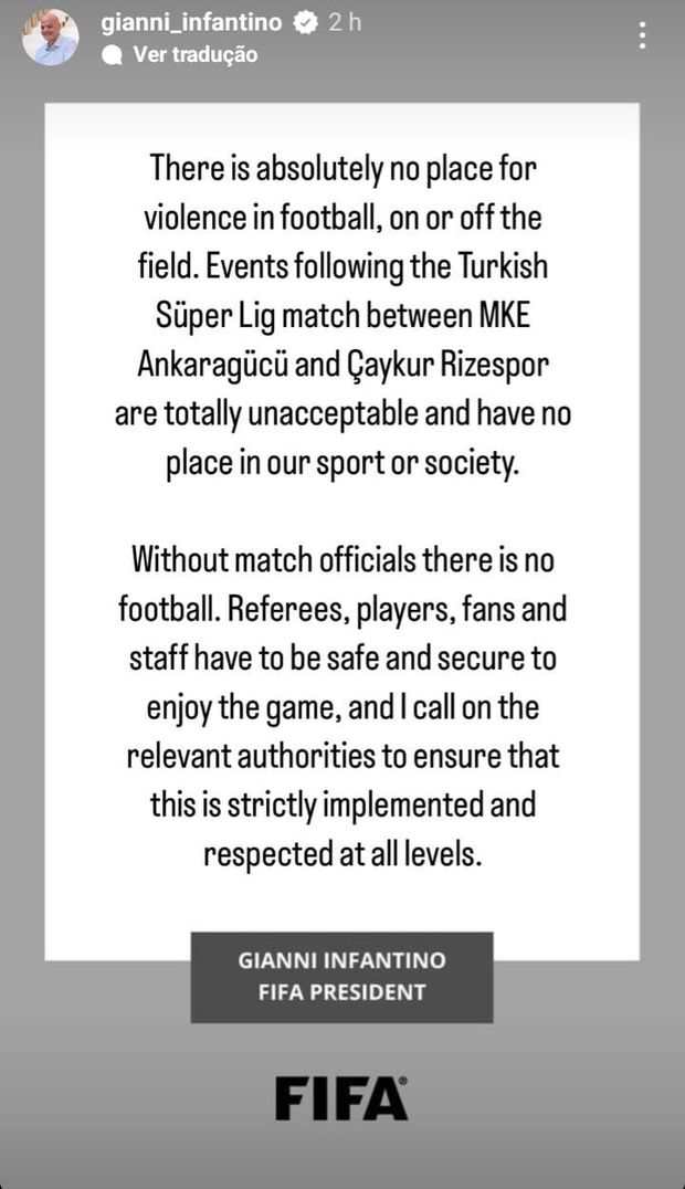 «Não há absolutamente nenhum lugar para a violência no futebol. Dentro ou fora de campo. O que aconteceu após o jogo da liga turca entre o Ankaragucu e o Rizespor é totalmente inaceitável e não tem qualquer lugar no nosso desporto e sociedade.» Assim foi a reação do Presidente da FIFA, Gianni Infantino, à agressão do presidente do Ankaragucu, Faruk Koca, ao árbitro da partida com o Rizespor, Halil Umut Meler.