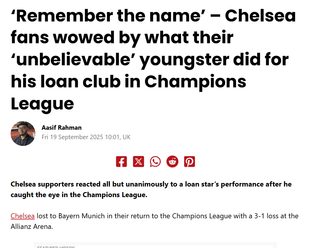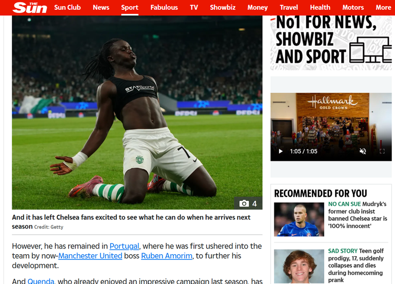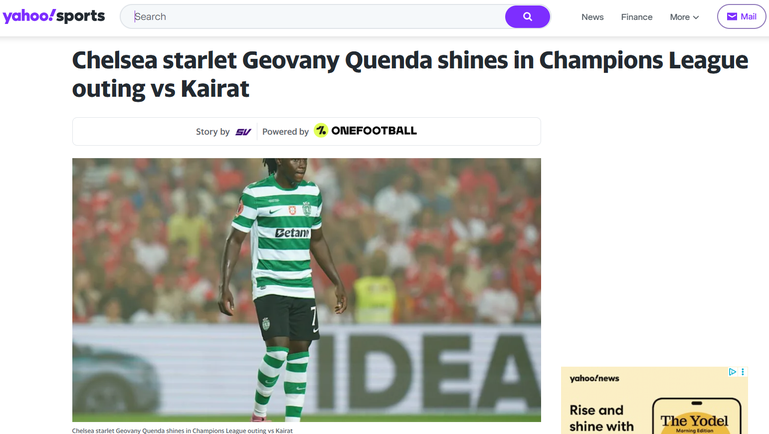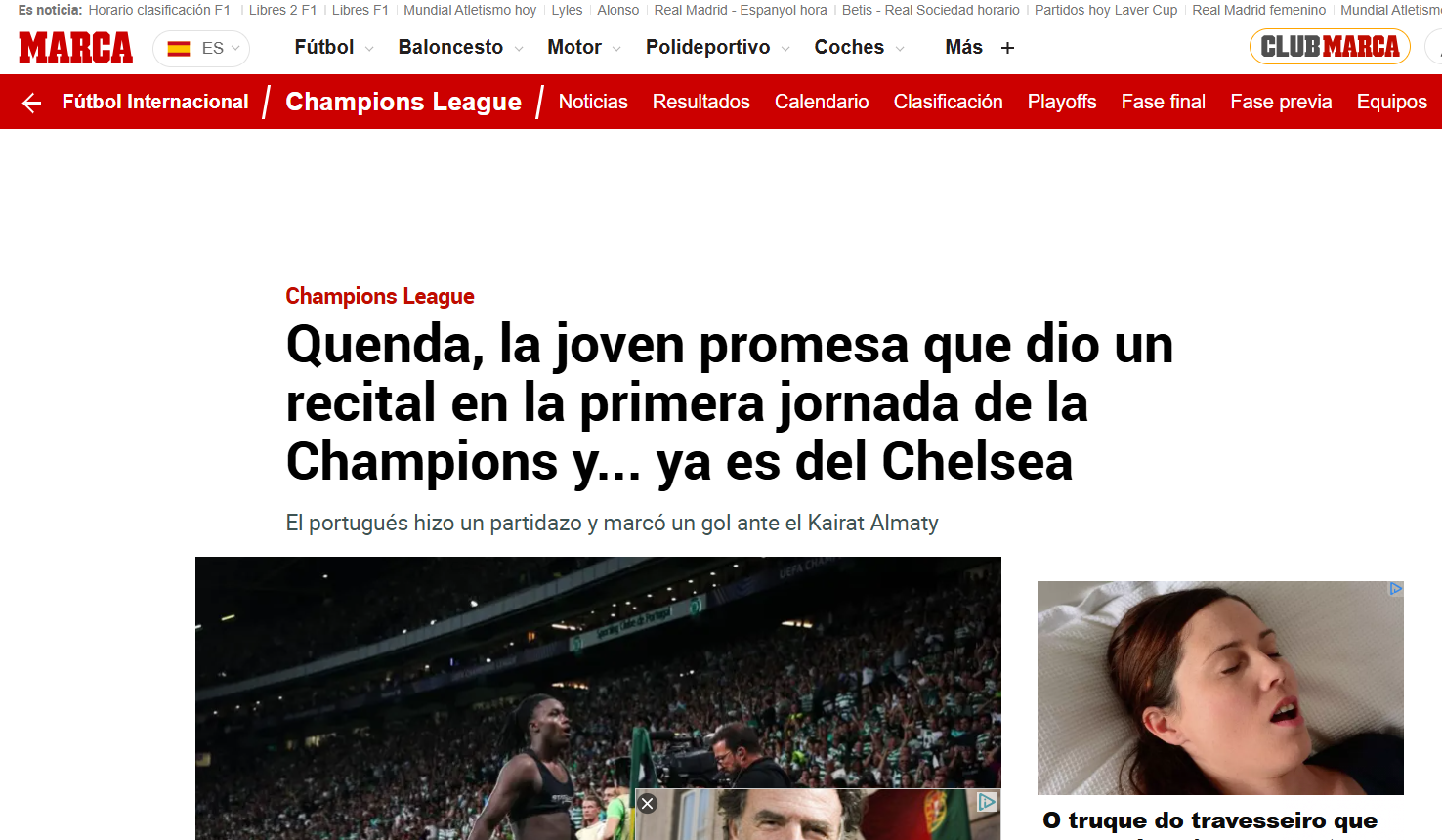 A exibição também teve eco, obviamente, em Inglaterra, nomeadamente dos adeptos dos blues, ansiosos pela chegada daquele que consideram ser «um dos jovens mais empolgantes do futebol mundial», descreve o The Sun. O Sports View, por sua vez, lembra que a chegada de Quenda vai ser a... «desgraça» de Pedro Neto no Chelsea. Uma onda de elogios ao jovem leão que pretende quebrar todos os recordes esta época. Ele que com o golo ao Kairat tornou-se no segundo português mais jovem de sempre a marcar na prova (18 anos, 4 meses e 20 dias), apenas superado por António Simões (18 anos, 3 meses e 8 dias).