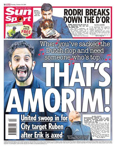 O 'The Sun' inovou e foi com uma versão alterada da cancação 'That's Amore, de Dean Martin, que deu as boas-vindas ao técnico dos leões. «Quando despedes um flop holandês e precisas alguém de top... é o Amorim», lê-se na primeira página do tabloide.