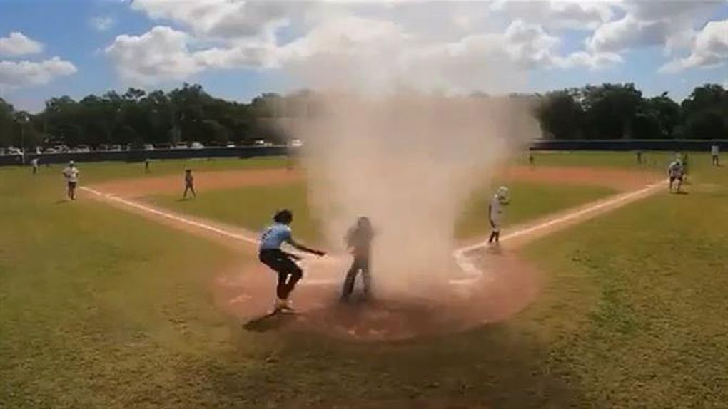 O árbitro de um jogo de juniores de basebal resgatou um dos jogadores de um minitornado, que surgiu inesperadamente em campo, na Flórida, Estados Unidos.