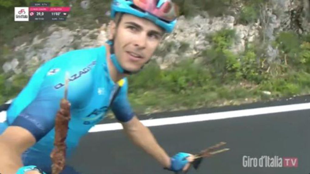 O ciclista italiano Samu Batti (Astana) foi presenteado pelos adeptos com espetadas de carne durante a sétima etapa da Volta a Itália.
