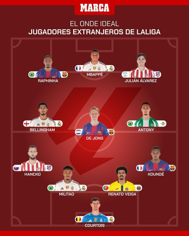 A baliza fica entregue a Courtois (Real Madrid), enquanto Koundé (Barcelona) e Hancko (Atlético de Madrid) completam a linha defensiva. No meio-campo surgem Frenkie de Jong (Barcelona), Jude Bellingham (Real Madrid) e Antony (Betis). Na frente, um trio... diabólico: Julián Álvarez (Atlético de Madrid), Mbappé (Real Madrid) e Raphinha (Barcelona).