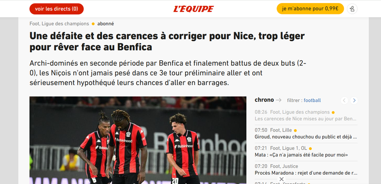 A vitória do Benfica sobre o Nice na primeira mão da terceira pré-eliminatória da Champions League foi destacada na imprensa internacional, que viu em Ivanovic a figura do encontro.