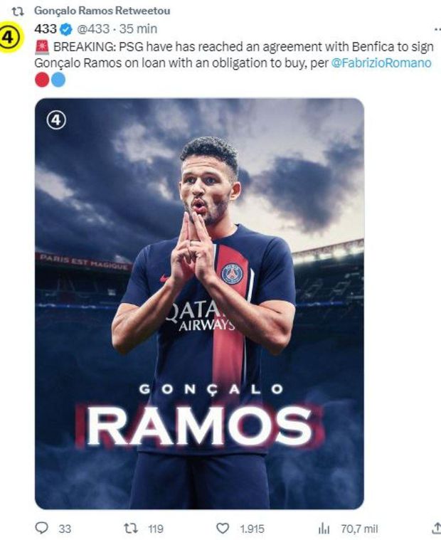 A mudança de Gonçalo Ramos para o Paris Saint-Germain está iminente e já nem o próprio (ainda) jogador do Benfica esconde a alegria pela transferência, que será feita por empréstimo, com opção de compra obrigatória de €65M, mais €15M em bónus mediante o cumprimento de objetivos.