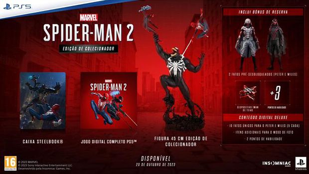 A Edição de Colecionador promete fazer muitos fãs perder a cabeça. Está disponível por 249,99 euros e também inclui um voucher que dá acesso a todos os conteúdos da Edição Digital Deluxe, e ainda uma caixa steelbook® e uma extraordinária figura/ estátua de alta qualidade, com 45 cm, de ambos os Homem-Aranha frente a frente ao icónico Venom.