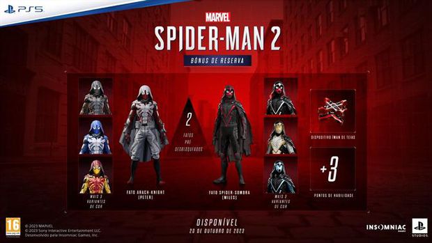Esta edição está disponível na PlayStation Direct desde dia 16. Mas os bónus de reserva não se ficam por aqui. Quem reservar qualquer uma destas edições receberá os seguintes bónus: dois fatos pré-desbloqueados (Fato Arach-Knight para o Peter, e Fato Spider-Sombra para o Miles – cada um com três variantes de cor); Dispositivo Íman de Teias e Três pontos de habilidade.