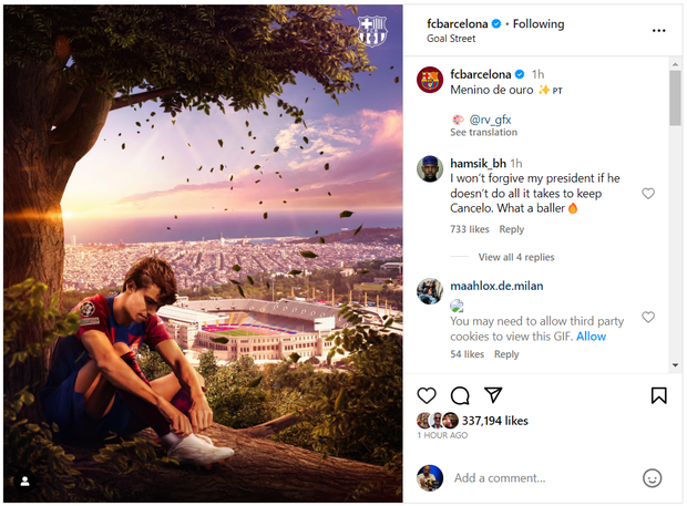 O Barcelona elogiou João Félix nas redes sociais logo após o triunfo frente ao FC Porto na Liga dos Campeões. «Menino de ouro» foi o título encontrado para o português, que marcou o golo da vitória diante da equipa de Sérgio Conceição.