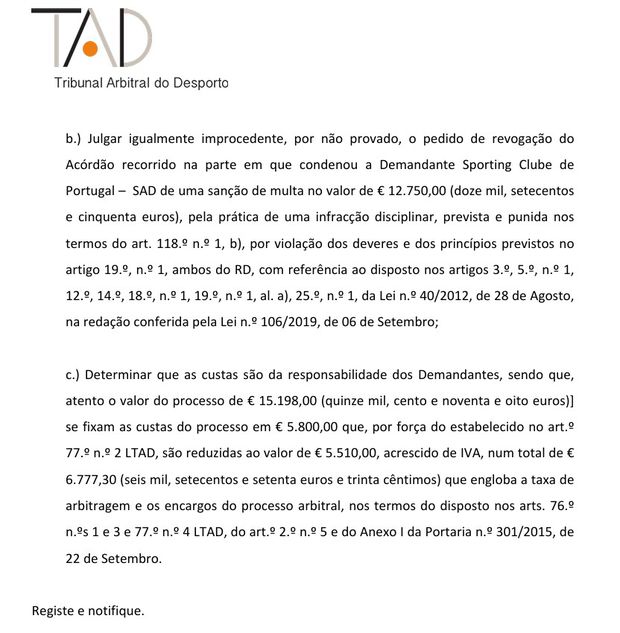 Além das multas, a SAD leonina também foi condenada a pagar as custas judiciais do processo, no valor de 6.773 euros.