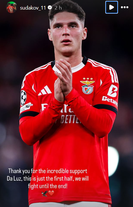 Outra reação chegou de Sudakov, o médio ucraniano, também na rede social Instagram: «Obrigado pelo incrível apoio do Estádio da Luz, é apenas a primeira parte, vamos lutar até ao fim!»