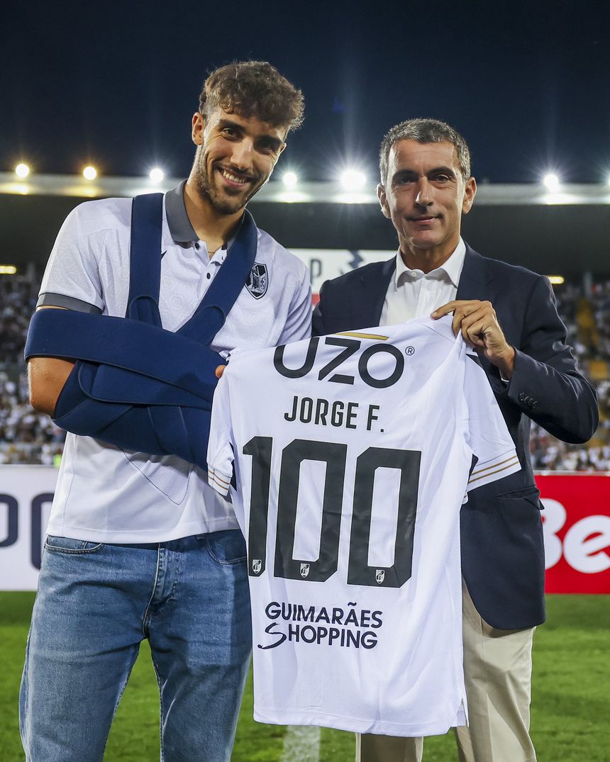 Minutos antes do apito inicial na receção ao Famalicão, que os vitorianos venceram por 2-1, Jorge Fernandes foi chamado pelo presidente do clube, António Miguel Cardoso, para receber a camisola comemorativa dos 100 jogos disputados de branco e preto.
