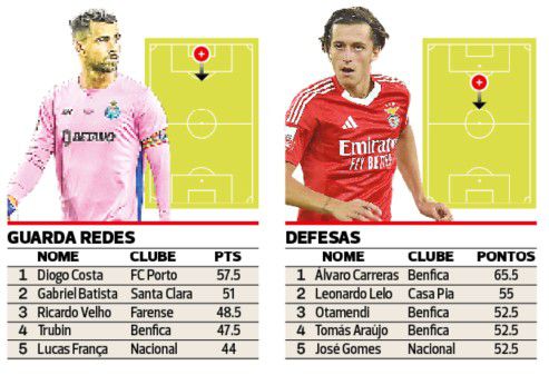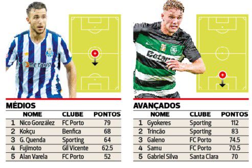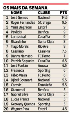 Referência ainda para o salto de oito lugares de Otamendi (21.º), que marcou pela terceira vez na sequência de pontapé de canto. Nos trinta da frente passam a figurar Pavlidis, o vencedor semanal José Gomes e Hjulmand.