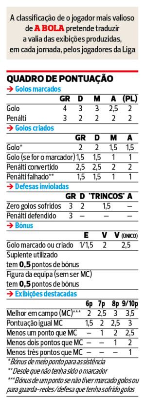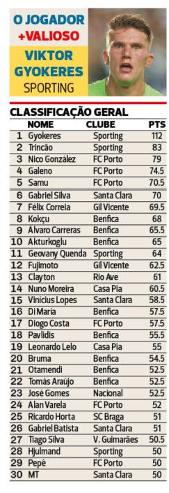 O mistério quanto aos problemas físicos de Viktor Gyokeres vai-se adensando e os poucos minutos jogados pelo sueco nos últimos tempos — somou apenas dois pontos nas derradeiras três rondas — poderiam ter posto em causa a sua posição no topo da tabela de O jogador mais valioso de A BOLA da Liga que ocupa desde a 4.ª jornada. Mas como os principais rivais disseram adeus a Portugal (Nico González e Galeno) ou estão também bem distantes do que já fizeram (o desgastado Trincão), o nórdico mantém a sua folgada liderança. Entre os primeiros o destaque vai assim para Samu — sem marcar há cinco jornadas quando faturara em nove dos anteriores 12 jogos para a Liga! — autor da assistência para o golo da igualdade portista no clássico do Dragão e que subiu ao 5.º lugar.