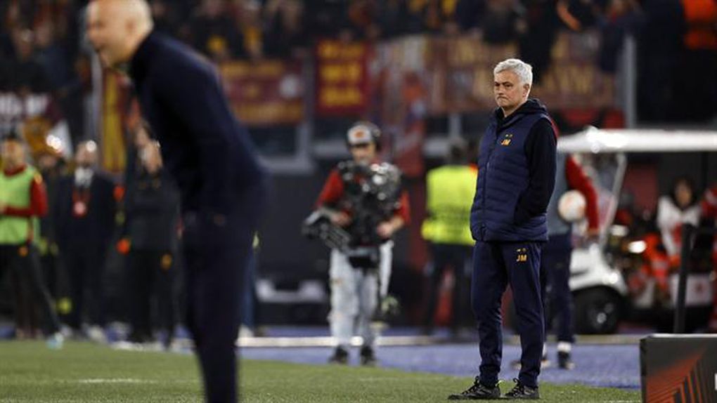 José Mourinho ‘pegou-se’ no túnel de acesso aos balneários, na quinta-feira, com Arne Slot, treinador do Feyenoord, depois de a Roma ter eliminado os neerlandeses nos quartos de final da Liga Europa.