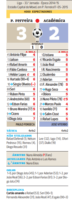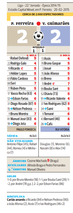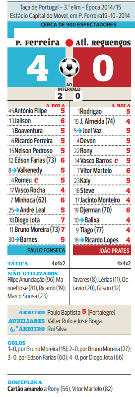 O treinador pacense, no final do jogo, foi claro: «Gostei de todos os jogadores, incluindo o Jota, que ainda é júnior. Marcou um golo e podia ter feito outro.» A escolha de A BOLA para melhor em campo foi óbvia: Diogo Jota.