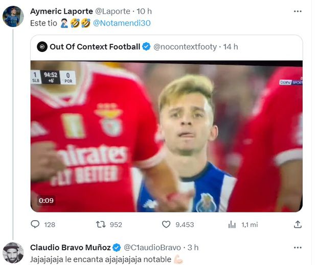 Na resposta, Otamendi atirou um beijo na direção de Francisco Conceição, segurando e apontando para a braçadeira de capitão. Gesto que foi muito apreciado por Laporte e também por Claudio Bravo, guarda-redes internacional chileno, que também comentou a publicação.