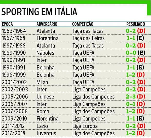 Sim, o Sporting vai tentar fazer amanhã aquilo que nunca fez em Itália em jogos de competições europeias: vencer. E este jogo com a Juventus será a 16.ª tentativa. Contas feitas, 15 partidas, apenas quatro empates e 11 derrotas. Uma história que começou na longínqua época de 1963/1964 - derrota com a Atalanta por 0-2 numa eliminatória que haveria de ser virada a favor dos leões em Alvalade com um triunfo por 3-1 - e que terminou, curiosamente, com a equipa de Turim, em 2017/2018, quando os leões perderam em Itália, por 1-2, na fase de grupos da Liga dos Campeões.
