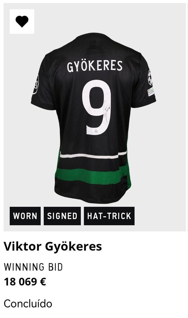 Os números subiram de dia para dia. E fecharam hoje com um número elevadíssimo. O leilão da camisola que Viktor Gyokeres utilizou na goleada dos leões ao Manchester City, por 4-1, na Liga dos Campeões, rendeu mais de… 18 mil euros! Após vários dias em licitação – no dia após a esta partida o artigo já rendia quase três mil euros – o leilão levado a cabo pelo site MatchWornShirt terminou com a camisola do avançado a valer 18.069 euros.