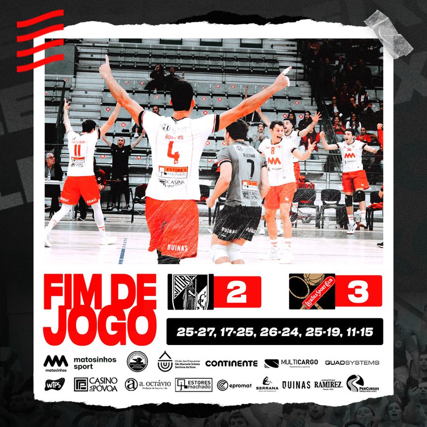 A equipa de Matosinhos venceu mesmo os dois primeiros 'sets', com os parciais de 25-27 e 17-25. O Vitória reagiu, e respondeu na mesma moeda (26-24 e 25-19), mas na decisão o Leixões foi mais forte (11-15).