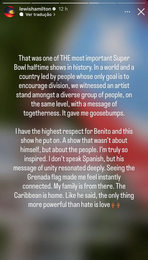 «Tenho o maior respeito por Benito [Bad Bunny] e por este espetáculo que ele fez. Um espetáculo que não foi para ele próprio, mas para as pessoas. Estou realmente muito inspirado. Não falo espanhol, mas a sua mensagem de unidade ressoou profundamente em mim. Ao ver a bandeira de Granada, senti-me imediatamente ligado. A minha família é de lá. As Caraíbas são a minha casa. Como ele disse, a única coisa mais forte do que o ódio é o amor», concluiu Hamilton.