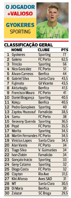 Bem vigiado pela defesa bracarense (chapeau a Diakaté…) Viktor Gyokeres teve pouca influência na vitória sportinguista em Braga (apesar de ter participado no derradeiro golo ao aguentar a pressão de um adversário antes de endossar a bola a Trincão) mas mantém larga vantagem na classificação de O jogador mais valioso de A BOLA da Liga sobre Galeno, o melhor dragão na Luz onde iniciou a jogada do solitário golo portista.