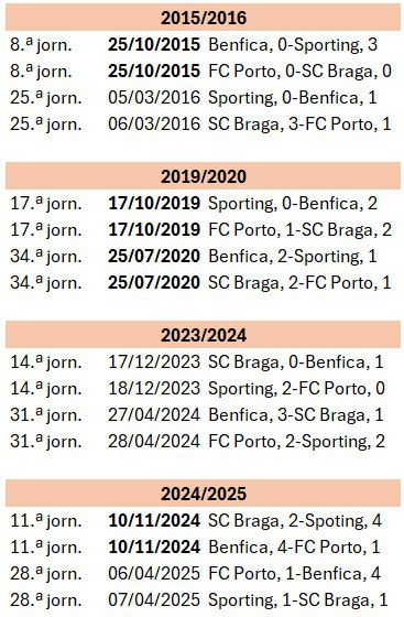 Antes, recuando dez temporadas, tinha havido em 2015/2016 Benfica-Sporting e FC Porto-SC Braga à jornada 8 (troca de posições na 25.ª) e exatamente o inverso em 2019/2020, com dérbi em Alvalade e receção portista aos minhotos na última ronda da primeira volta.