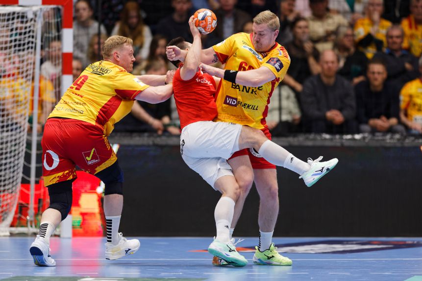 Os encarnados mantiveram-se na liderança até aos 12 minutos, quando se viram igualados e imediatamente ultrapassados pelos dinamarqueses (6-5), pela primeira vez em vantagem no jogo, com golo da sua estrela Tobias Grondahl, e assim permaneceram até aos 24 minutos, quando as águias deram a volta (11-12), concretizada com golo de Hanusz.
