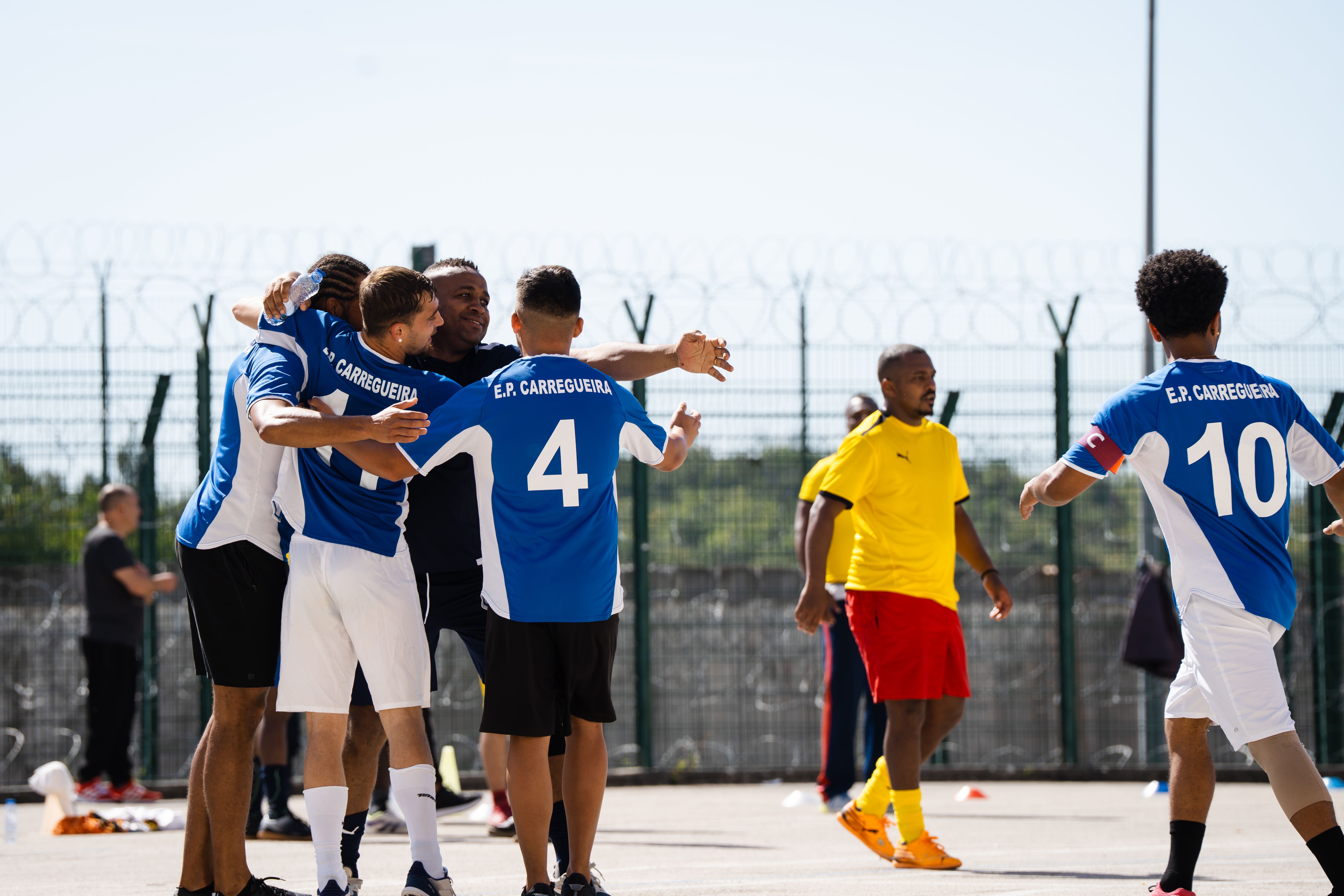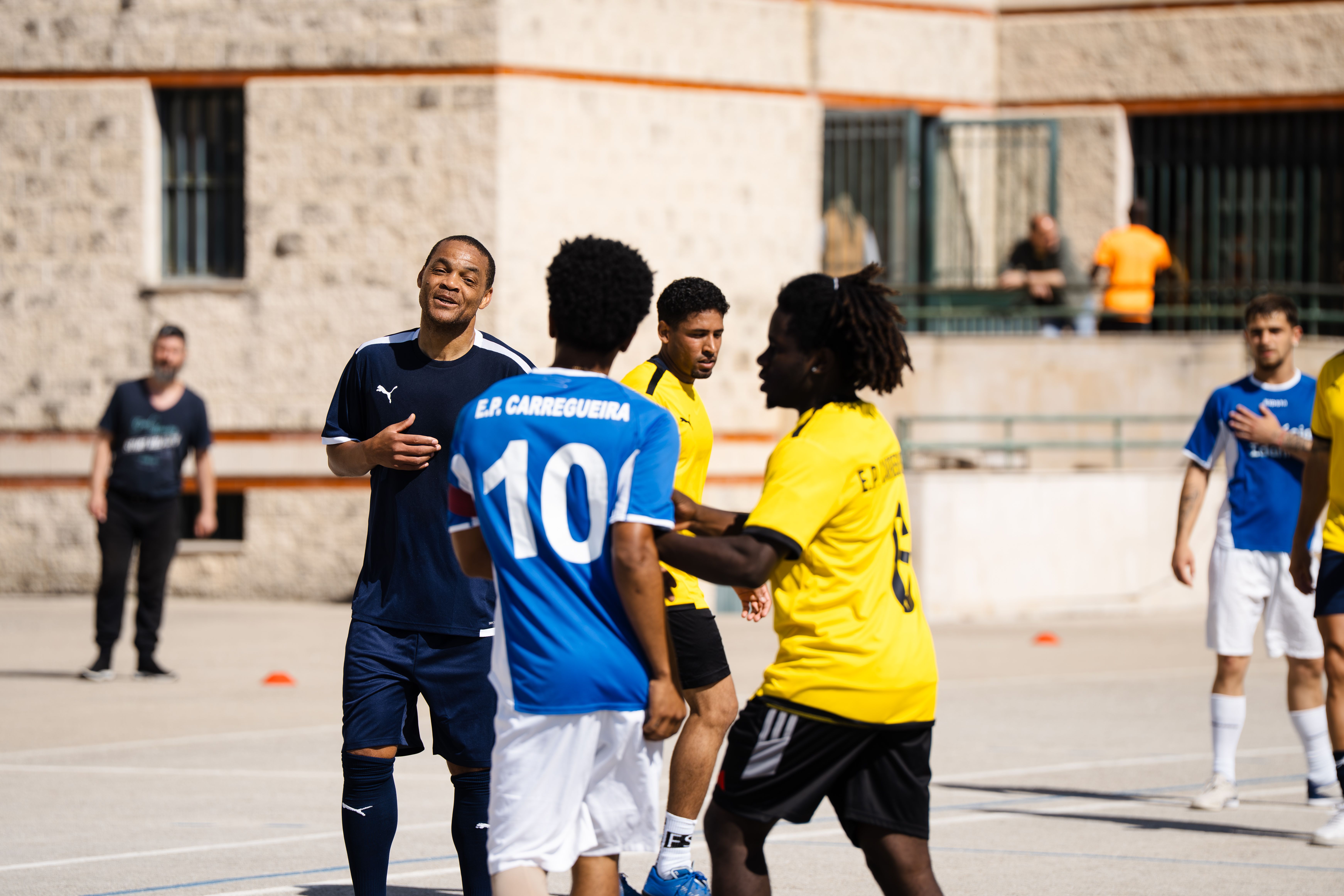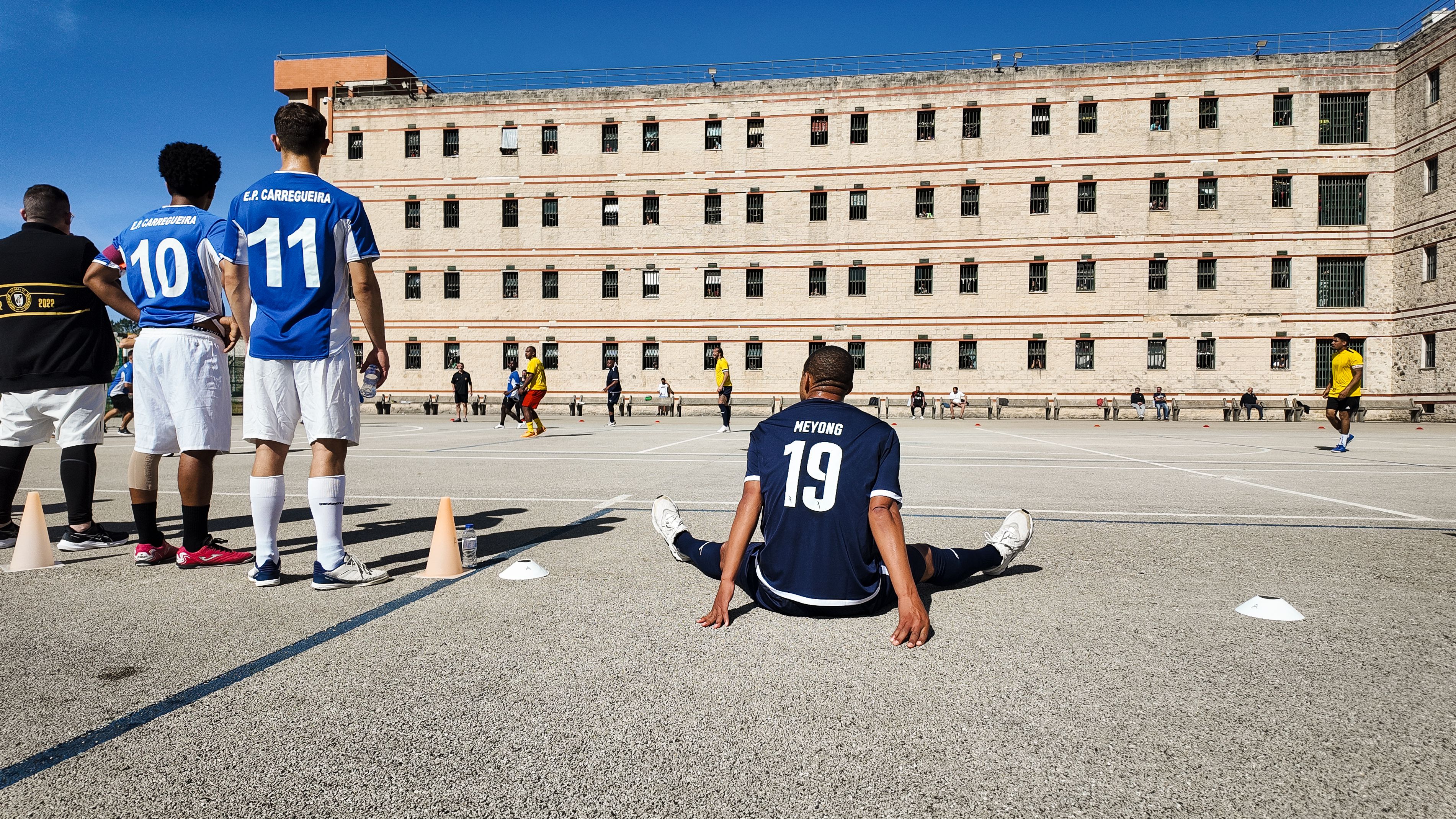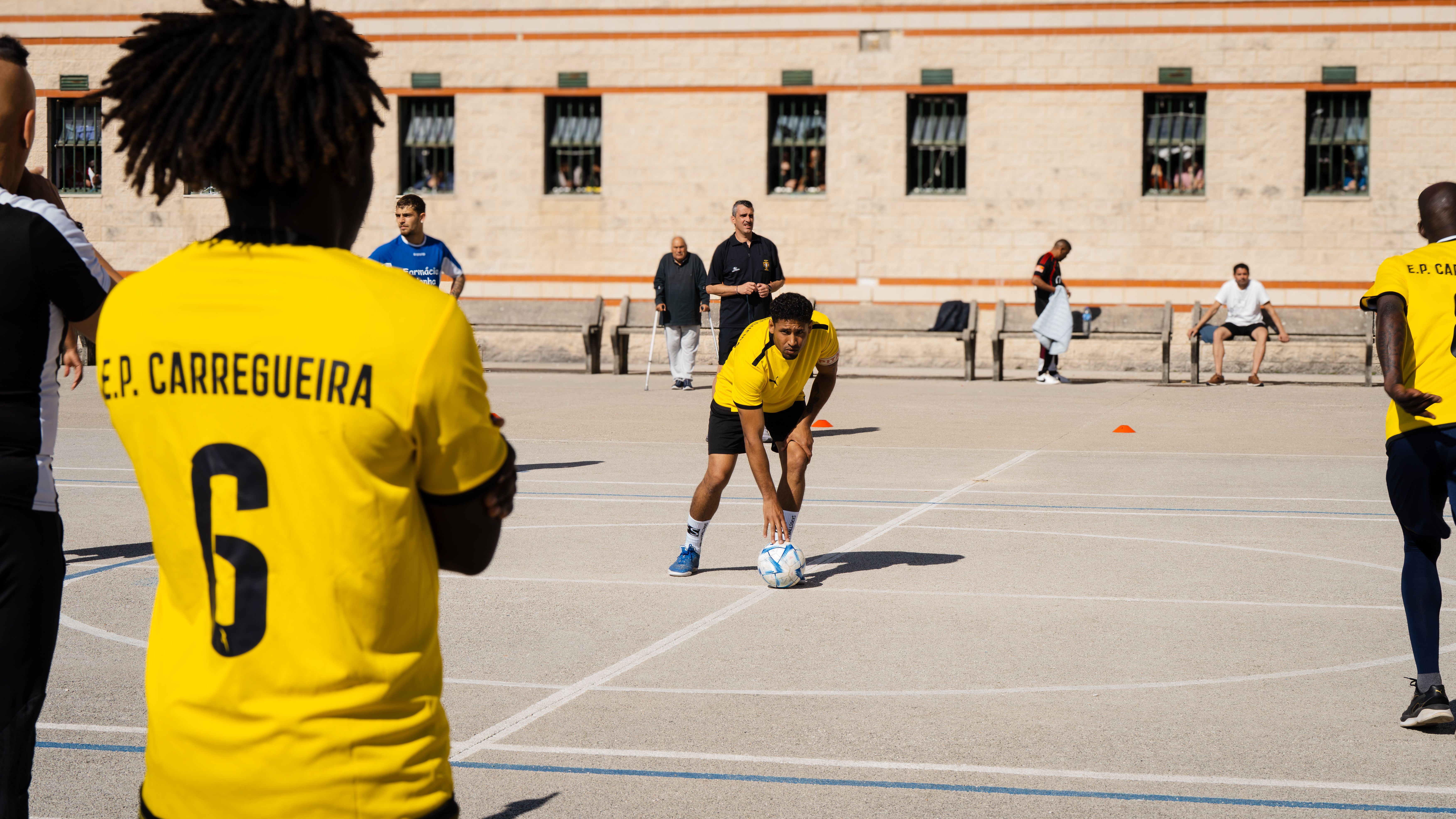 Jorge Andrade, Edinho, Carlos Fernandes, Meyong e Kléber, embaixadores da Liga Portugal, juntaram-se para suar a camisola, talvez mais do que esperavam, numa iniciativa da Fundação do Futebol, no Estabelecimento Prisional da Carregueira, nos arredores de Lisboa, para um jogo com uma seleção de reclusos. Um projeto piloto, que a Liga pretende replicar noutros estabelecimentos.