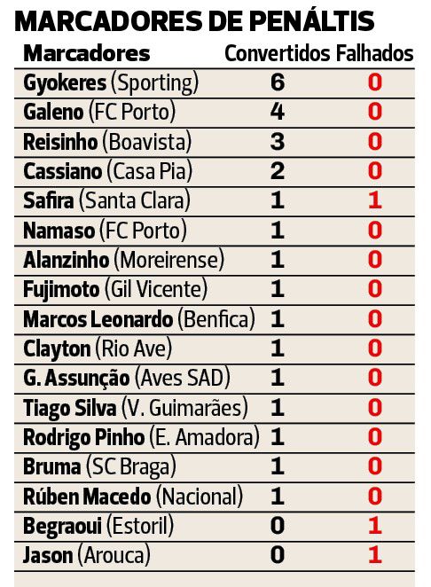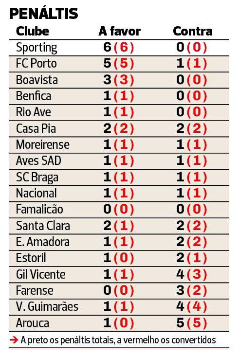 O Sporting já é de novo a equipa com mais penáltis na Liga, depois de, contra o Estrela da Amadora, na passada sexta-feira, ter beneficiado do sexto castigo máximo em dez jornadas. Gyokeres transformou (e converteu) todos. O FC Porto tem cinco a favor, quatro batidos por Galeno e um por Namaso, sempre com sucesso. O Boavista já teve três e nenhum outro clube passa os dois.
