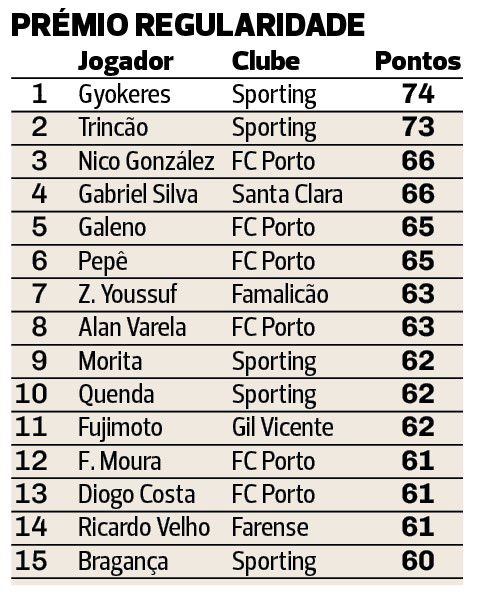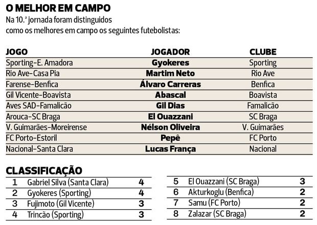 No prémio de regularidade de A BOLA, o somatório das notas atribuídas aos jogadores em cada partida, Gyokeres (com nota 9 após o póquer frente ao Estrela da Amadora) isolou-se na liderança, deixando para trás Trincão. O sueco alcançou também Gabriel Silva, do Santa Clara, na classificação dos melhores em campo — quatro distinções para cada um.
