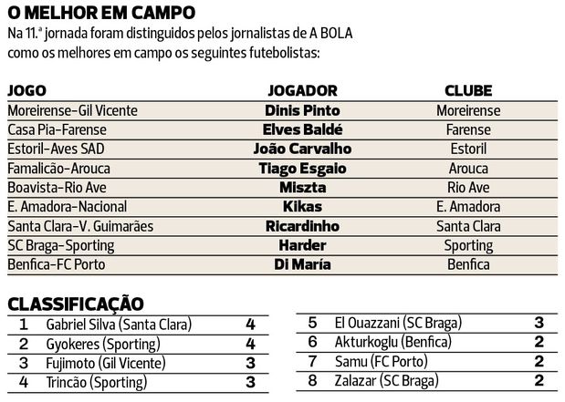 A exibição menos exuberante de Gyokeres em Braga permitiu a Trincão, pontuado com nota 7 por A BOLA (o sueco teve 6), alcançar o companheiro de equipa no Sporting no topo da tabela do prémio de regularidade, somatório das notas atribuídas aos jogadores pelos jornalistas de A BOLA em cada partida.