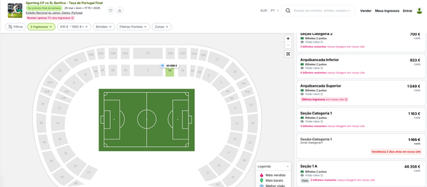 Uma rápida consulta no Viagogo, uma das plataformas mais conhecidas para revenda de bilhetes de espetáculos, permitiu aferir que há escolhas para todos... os bolsos: um dos vendedores está a pedir 46.358 euros por cada um de dois bilhetes que tem para o setor 1A, bem junto ao relvado. Entre os 400 e os 1.000 euros, há vários bilhetes à venda e os preços exorbitantes deverão crescer à medida do aproximar do dia do jogo...