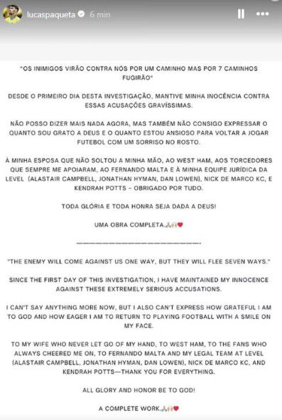 West Ham United can confirm that an independent Regulatory Commission has cleared Lucas Paquetá of misconduct charges made against him by the Football Association for alleged breaches of FA rule E5.