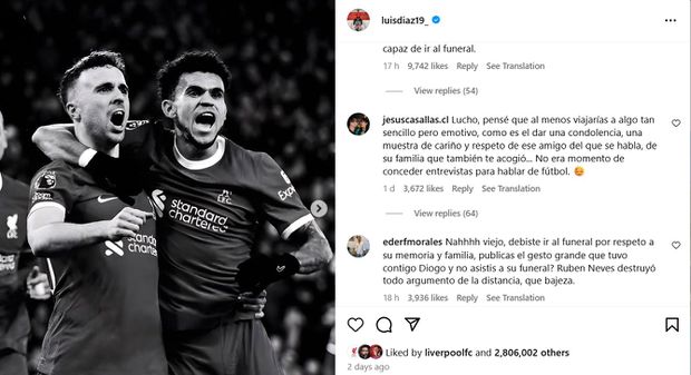Torcedores cobram Luís Diaz nos comentários de seu Instagram por não comparecer ao velório do Jota.