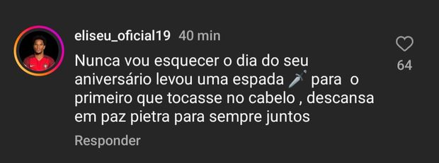 A propósito da brincadeira relatada por Luisão, também Eliseu recordou um episódio: «Nunca vou esquecer o dia do seu aniversário, em que levou uma espada para o primeiro que tocasse no cabelo. Descansa em paz Pietra, para sempre juntos.»