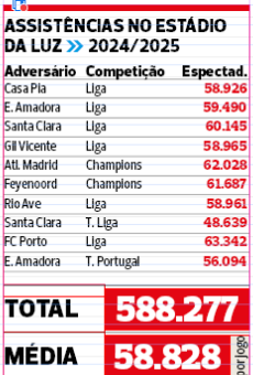 Até ao jogo de hoje, esta temporada já passaram pelo Estádio da Luz mais de meio milhão de espectadores — 588.277, o que dá uma média de assistência por jogo de 58,828 nos primeiros 10 desafios caseiros de 2024/2025.