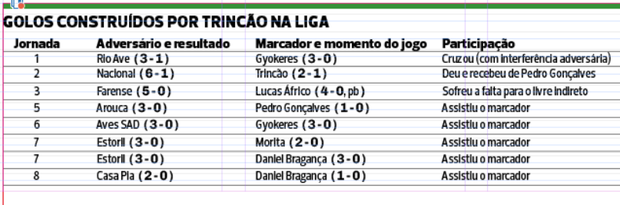 Dotado de excelente capacidade técnica (os seus dribles em progressão causam valente mossa às defesas contrárias…), visão de jogo e uma saudável irreverência, Trincão levou Gyokeres a faturar dois dos seis golos conseguidos pelo sueco em lances de bola corrida no campeonato. E Daniel Bragança também muito beneficiou do génio e altruísmo do extremo para fazer dois dos três golos que obteve.