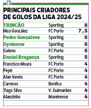 É que dos 27 golos marcados pelos leões na Liga, oito tiveram a participação direta na sua construção do jogador nascido em Viana do Castelo há 24 anos (ver quadro à parte), o que o coloca também como o maior criador de golos da Liga 2024/2025 nas primeiras oito jornadas (curiosamente só ficou em branco na vitória por 2-0 diante do FC Porto, à 4.ª jornada, e não esteve envolvido em qualquer dos seis apontados pelos leões nas outras competições, Supertaça e Champions). Lidera ainda o departamento das assistências com cinco, à frente do lateral portista Francisco Moura, que tem quatro.