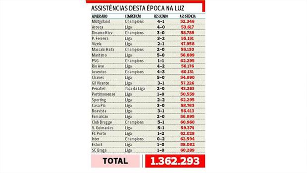 Mas, esta temporada, as enchentes acima de 50 mil pessoas na Luz foram uma constante, o que também ajuda a explicar a força que a equipa reflete nos seus números caseiros. Apenas em duas ocasiões a lotação ficou abaixo dos 50 mil: 47 mil contra o Vizela, para o campeonato, e 43 mil na receção ao Penafiel, para a Taça da Liga. A lotação total, nos 24 jogos oficiais realizados no recinto benfiquista, ascende a mais de 1,3 milhões de adeptos. Com o jogo de amanhã ultrapassará os 1,4 milhões.