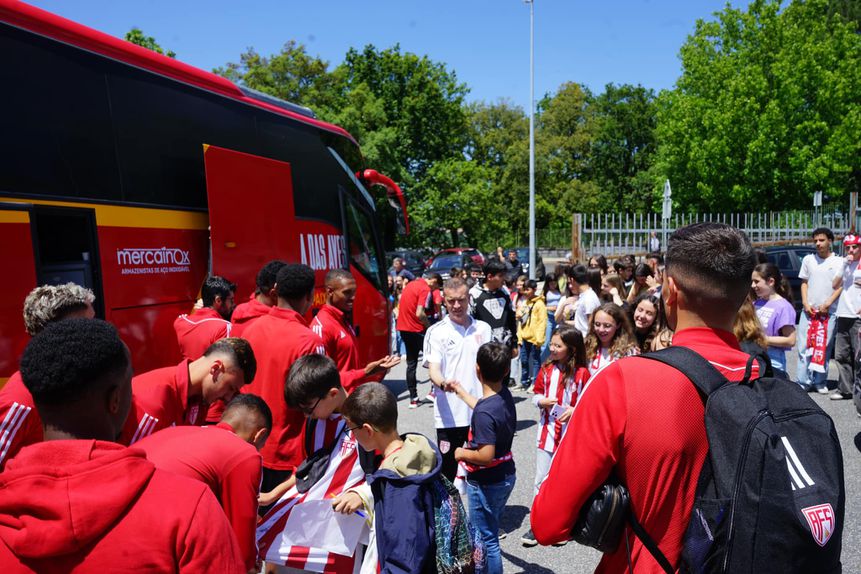 À saída para o Algarve, a comitiva do Aves SAD contou com o apoio de uma centena de crianças, que aproveitaram para confraternizar com os jogadores.