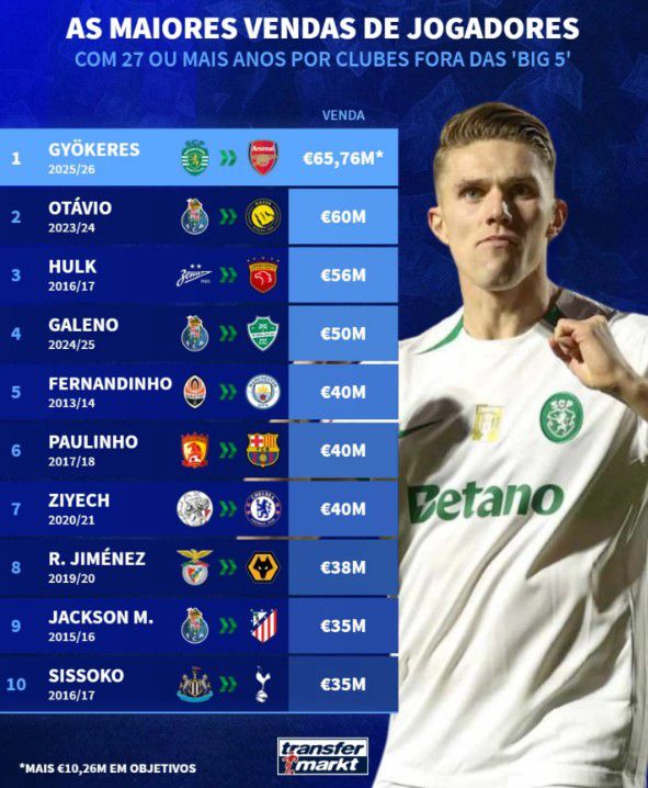 De acordo com o site Transfermarkt, especializado em transferências, nunca um jogador com 27 anos, ou mais, a jogar das cinco principais ligas tinha sido transferido por tanto dinheiro como Gyokeres.