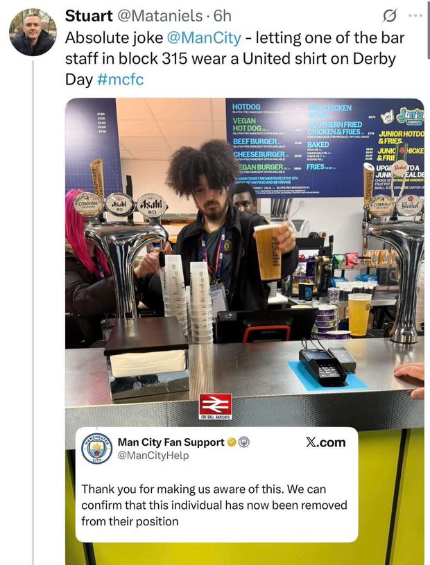 A conta @Mataniels na rede social X deu conta do sucedido, ao publicar uma fotografia do trabalhador em questão, escrevendo: «Que piada o Manchester City deixar um dos funcionários do bar no bloco 315 usar uma camisola do United no dia do dérbi.»