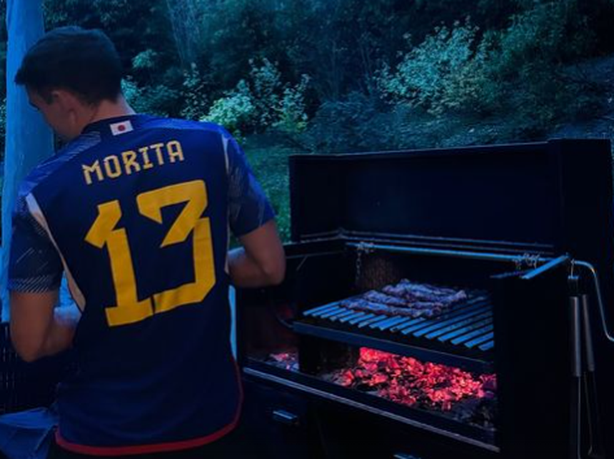 O jogador uruguaio de 22 anos partilhou uma story na sua conta de Instagram, na qual surge a fazer grelhados com a camisola do internacional nipónico vestida.