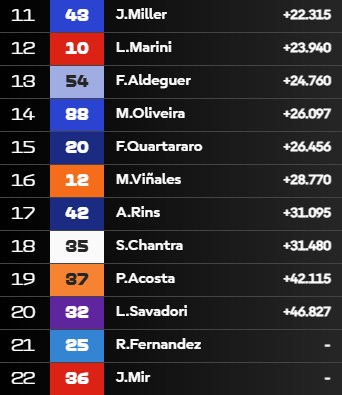 Numa corrida que não contou com o campeão do mundo Jorge Martín (lesão na mão esquerda), e que ficou marcada pelas quedas de Pedro Acosta e Joan Mir, Miguel Oliveira conseguiu terminar em lugares de pontos: partiu da 17.ª posição e acabou em 14.º (+26.097), no seu 100.º Grande Prémio na categoria rainha.