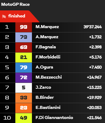 O piloto espanhol chegou a ser ultrapassado por Álex Márquez, na 7.ª volta, no entanto acabaria por retomar o comando da corrida (39'37.244), terminando à frente do irmão (+1.732) e de Pecco Bagnaia (+2.398): Ducati a dominar o pódio, à semelhança da corrida sprint.
