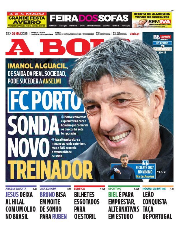 Imanol Alguacil, que vai deixar a Real Sociedad, é um dos principais candidatos a substituir Martín Anselmi no banco do FC Porto, escreve esta quinta-feira o jornal Marca, citando e confirmando a notícia em primeira mão de A BOLA.