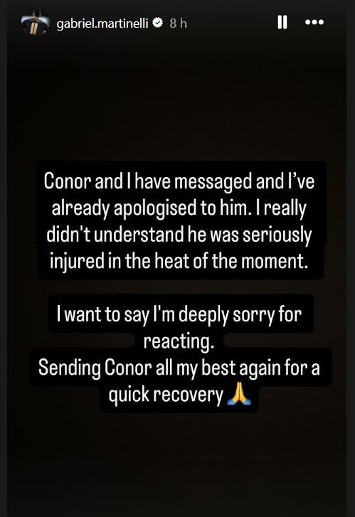 «Quero dizer que lamento sinceramente a forma como reagi. Desejo ao Conor tudo de bom e uma rápida recuperação», afirmou Martinelli numa publicação nas redes sociais.