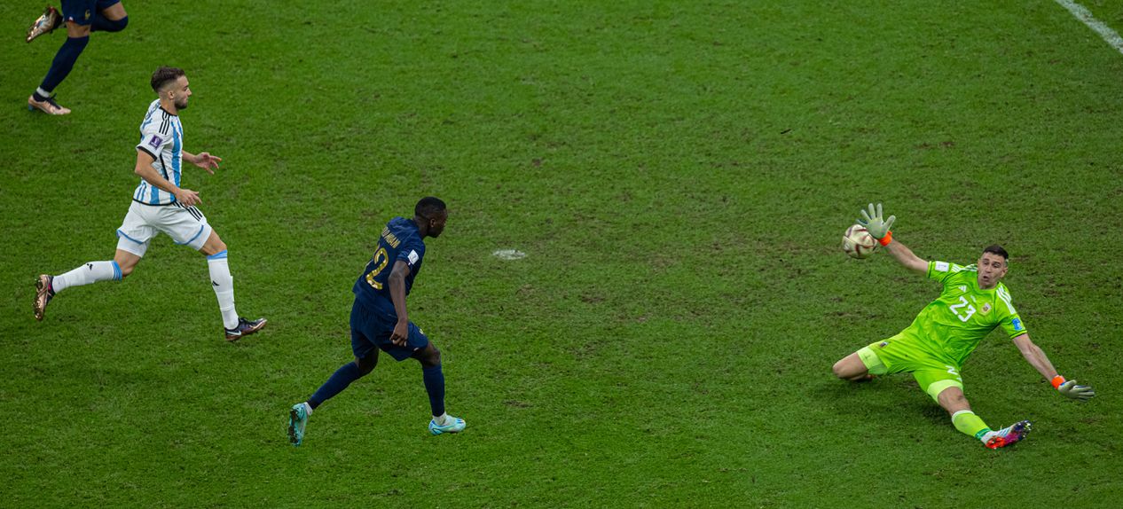 A Argentina começou a vencer a final do Mundial 2022 por 2-0, deixou-se empatar em três minutos e, já com 3-3 no minuto 120, no prolongamento, Kolo Muani teve a oportunidade de selar a reviravolta, não fosse Emiliano Martínez, com uma extraordinária defesa, a impedir aquele que seria, certamente, o golo da vitória da França. O jogo foi a penáltis e, no final, a Argentina conquistou o Mundial 2022.